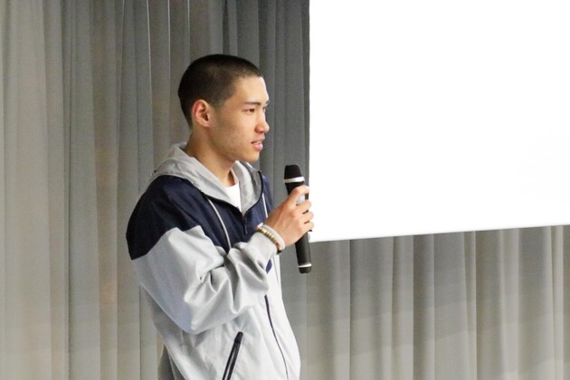 挨拶をする竹内蒼空さん(スポーツ科学部2年)