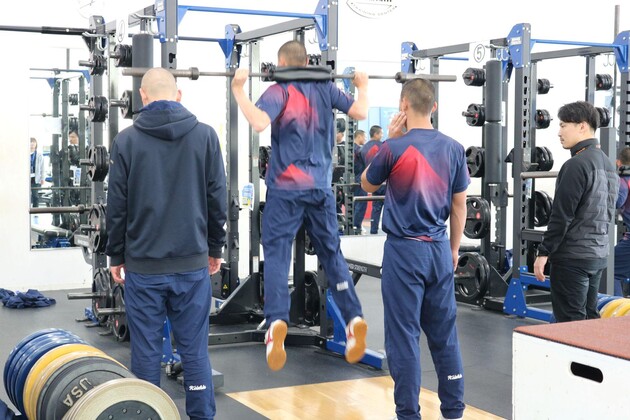 昼食後、約1,200平方㍍のエリアに、ベンチプレスラック、スクワットラック、プラットフォームが設置されているS&C(ストレングス・アンド・コンディショニング)ルームで、ウエイトトレーニングマシンを使ったトレーニングを体験した。