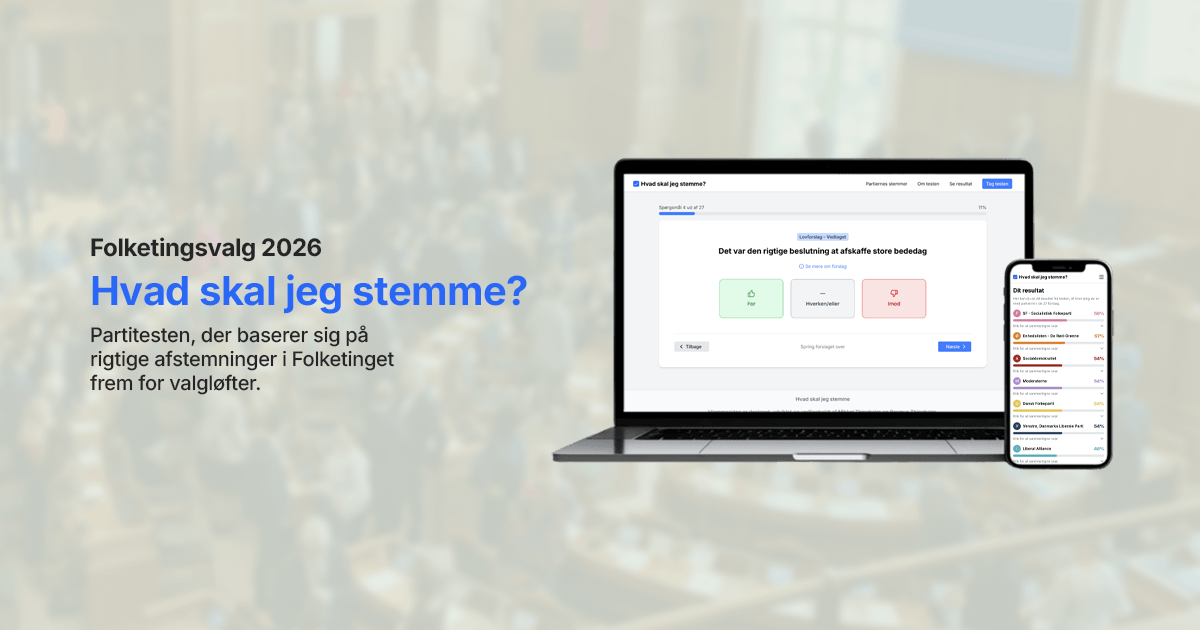 2022 年の選挙と同様に、私は兄と一緒に政党テストを開発しました。このテストでは、前回の選挙期間中にフォルケッティングで投票にかけられた立法、意思決定、および市民の提案に答えることができます。したがって、実際の行動に基づいてパーティーとマッチングされます。 その目的は、選挙の公約以上のものに基づいて十字架を立てることができるように、補足的な根拠を提供することです。 嬉しいですね。 Denmark