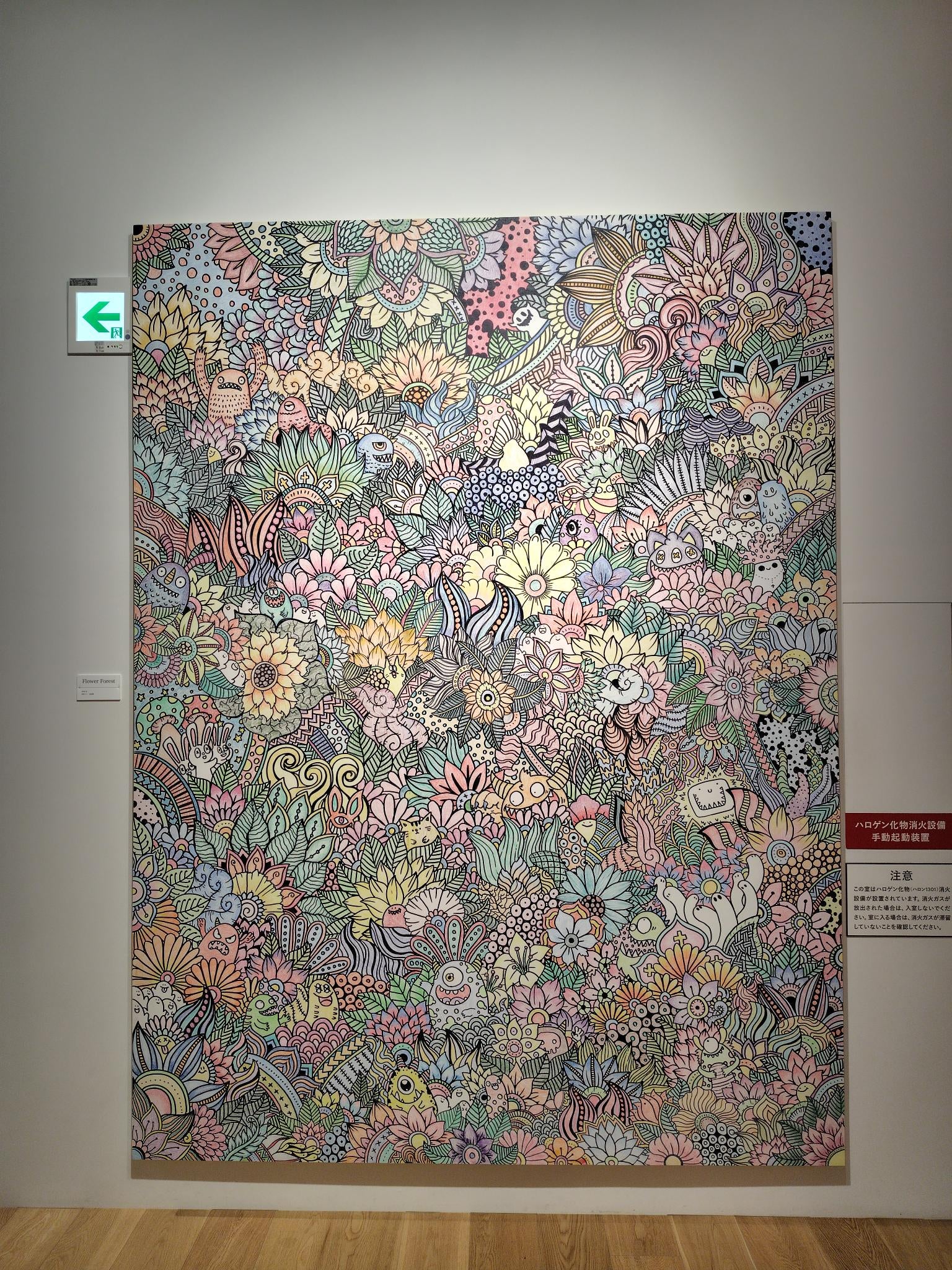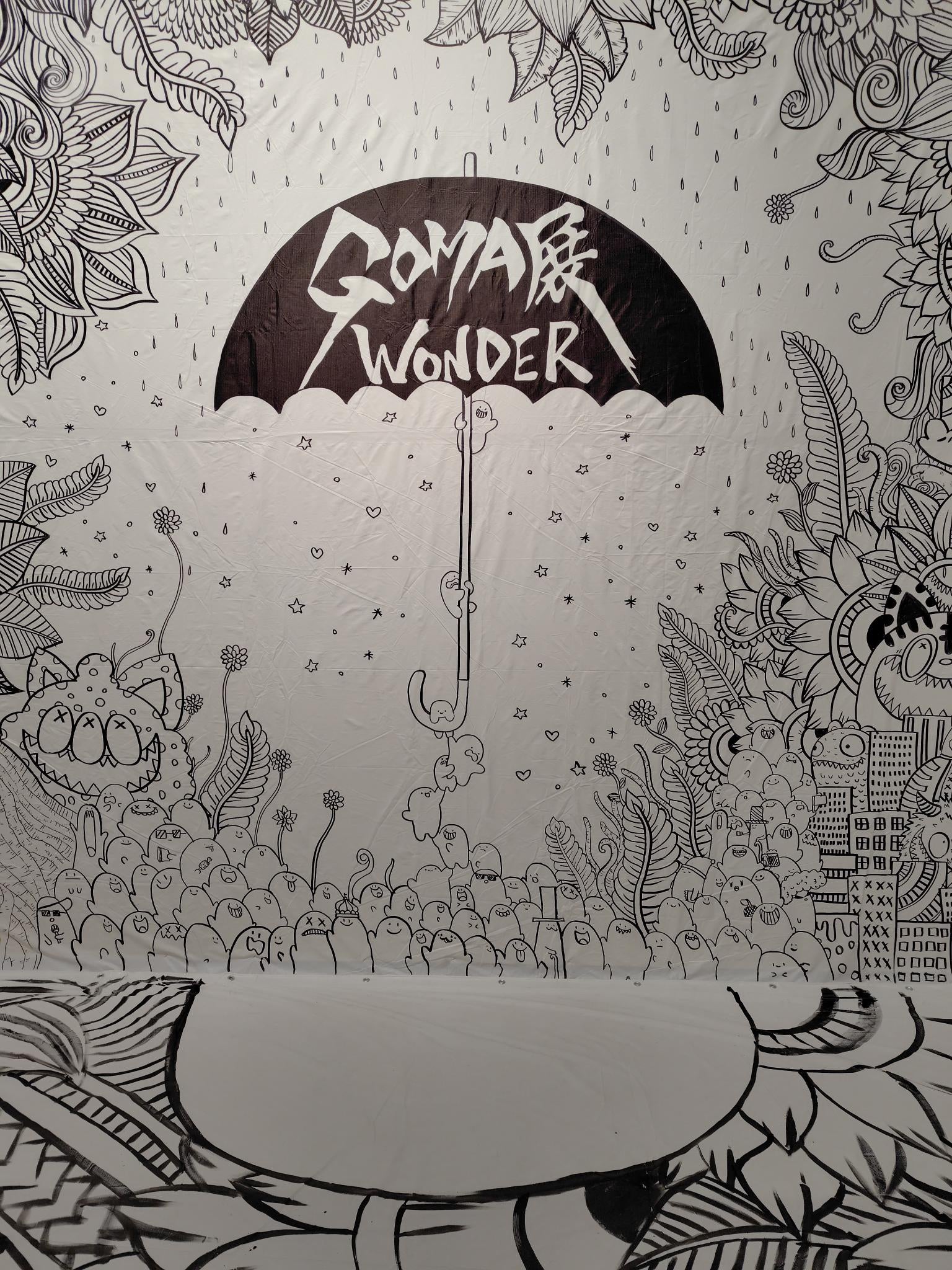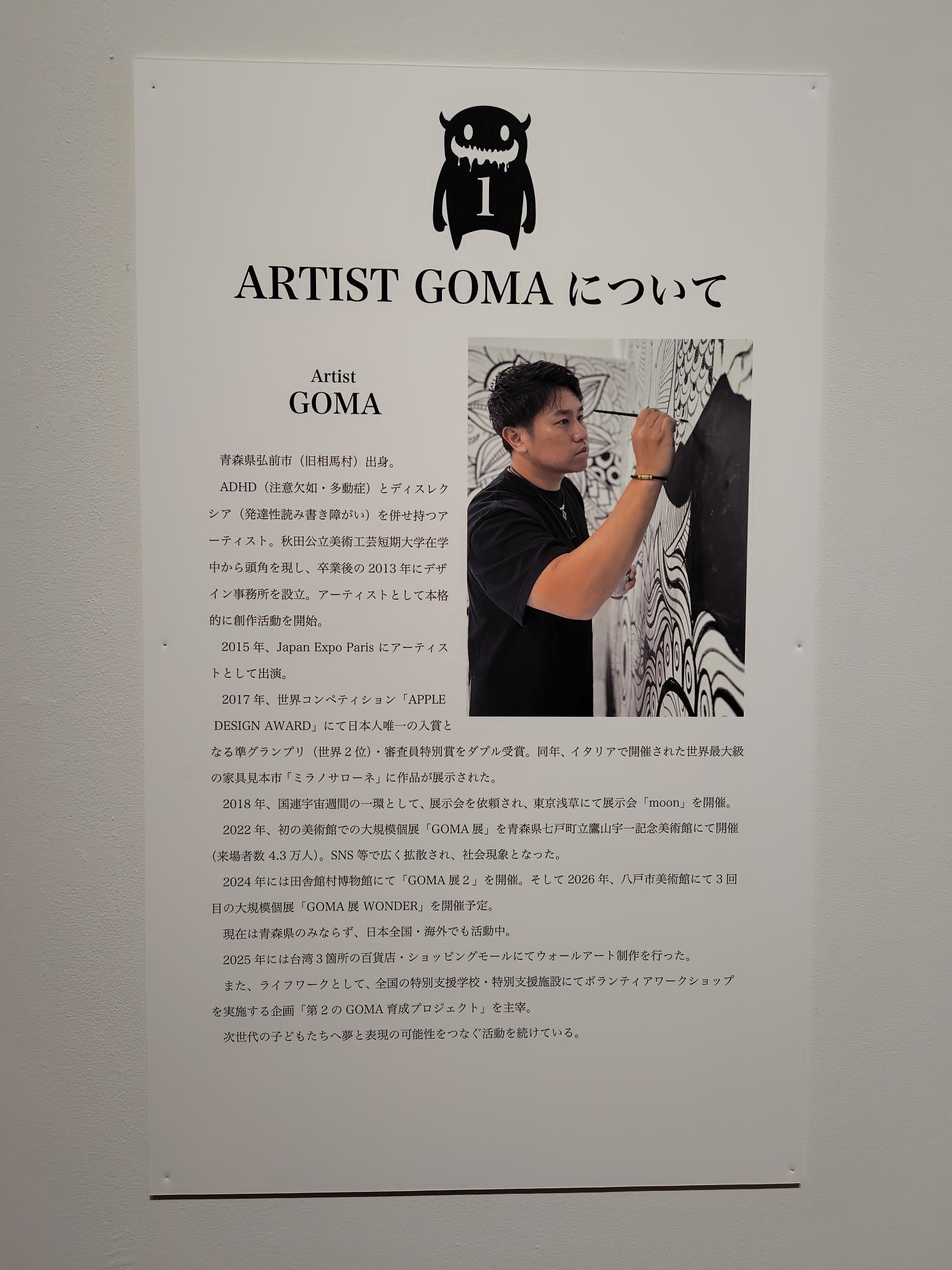 GOMAさんは弘前市の出身。ADHD(注意欠陥・多動症)とディスレクシア(発達性読み書き障がい)と診断されているそうです。2013年に26歳でアーティストになり、最初は「スプレーアーティスト」として活動していました。2015年にパリで開かれたJAPAN EXPO PARISにスプレーアートで参加した際、空き時間にステージ横の壁にペンで描いた即興画が大人気を博し、道を切り替えることになりました。ショッピングモールでライブアートを開いてファンが増え、2022年に初の大規模個展を青森県七戸町で開催。2回目を2024年に同田舎館村で開いて、今回が3回目になります。90%が新作だそうです。