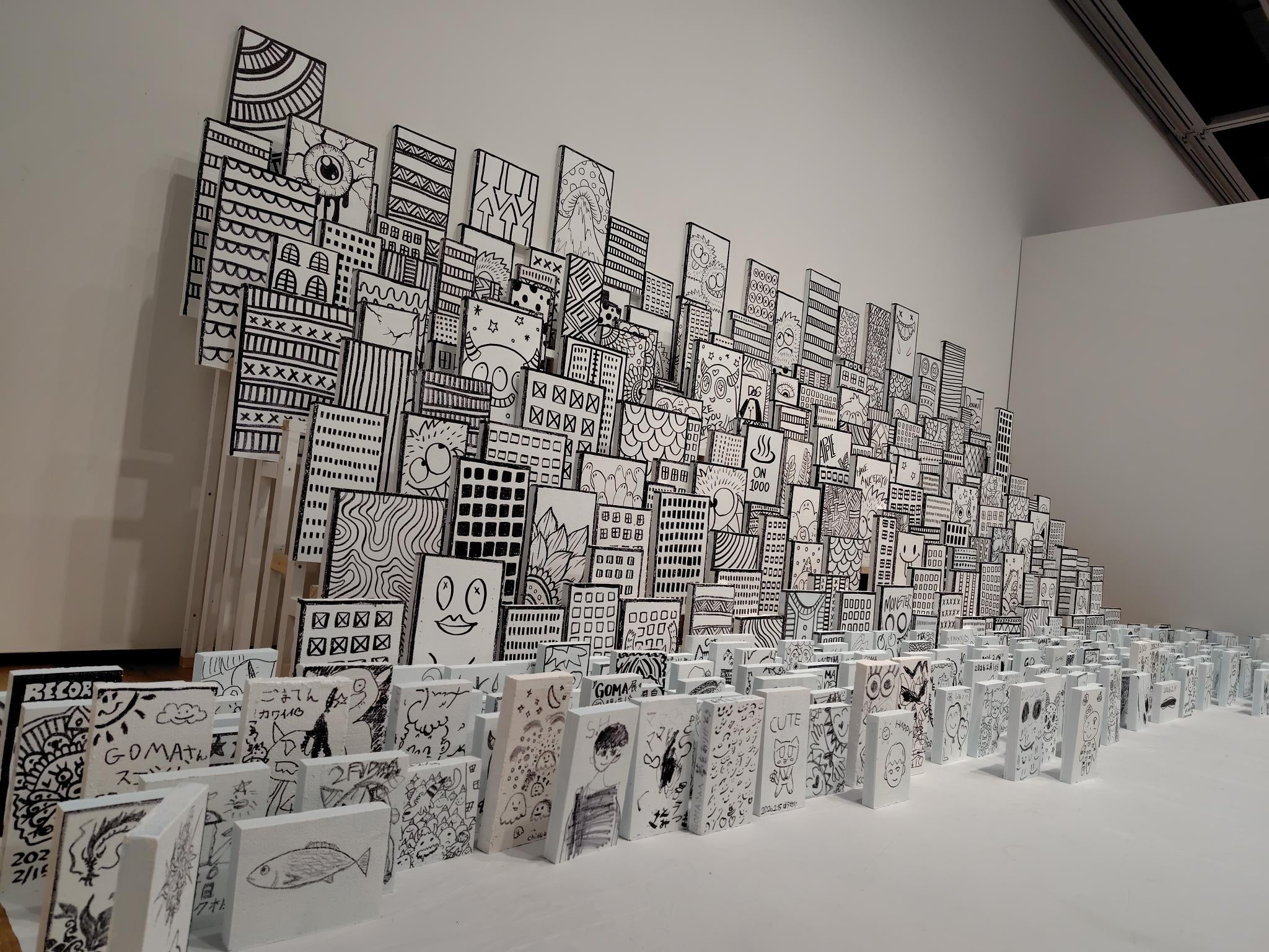 GOMAさんが中学生の頃、初めて描いたのがビル群の絵だったそうです。「このビルたちが立体になったらどうなるのだろう」という長年の思いが、展覧会で最初の一歩を踏み出しました。手前にある小さいビル群は、観覧者が描いたそうです。