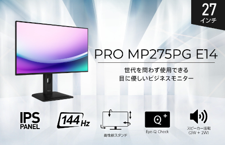 エムエスアイコンピュータージャパンは2月26日、ビジネス向けモニターの新モデルとして、27インチ、リフレッシュレート144Hz対応の高画質IPSパネルを採用した「PRO MP275PG E14」を家電量販店やPCショップなどで発売する。価格は2万7300円前後。