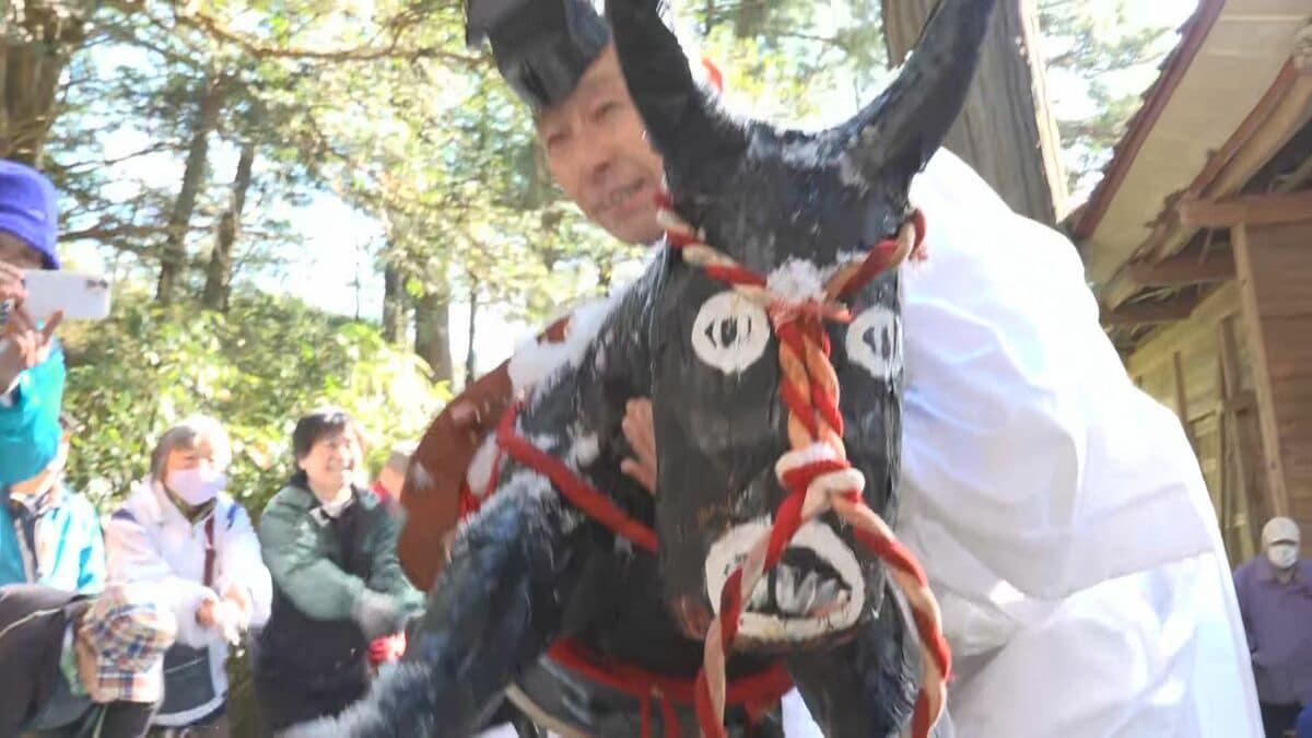 牛をめがけて「雪玉」を投げて水不足の解消願う…少雨影響で温泉施設が休業などの影響が 伝統の豊作を祈る祭り 長野・筑北村