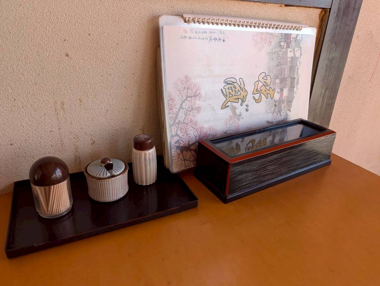 テーブル備え付け品は、割り箸、楊枝、各種調味料とお品書きです。