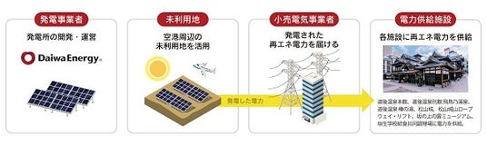 空港周辺未利用地を活用して、道後温泉本館や松山城など、主要観光施設へ再エネ電力を届ける