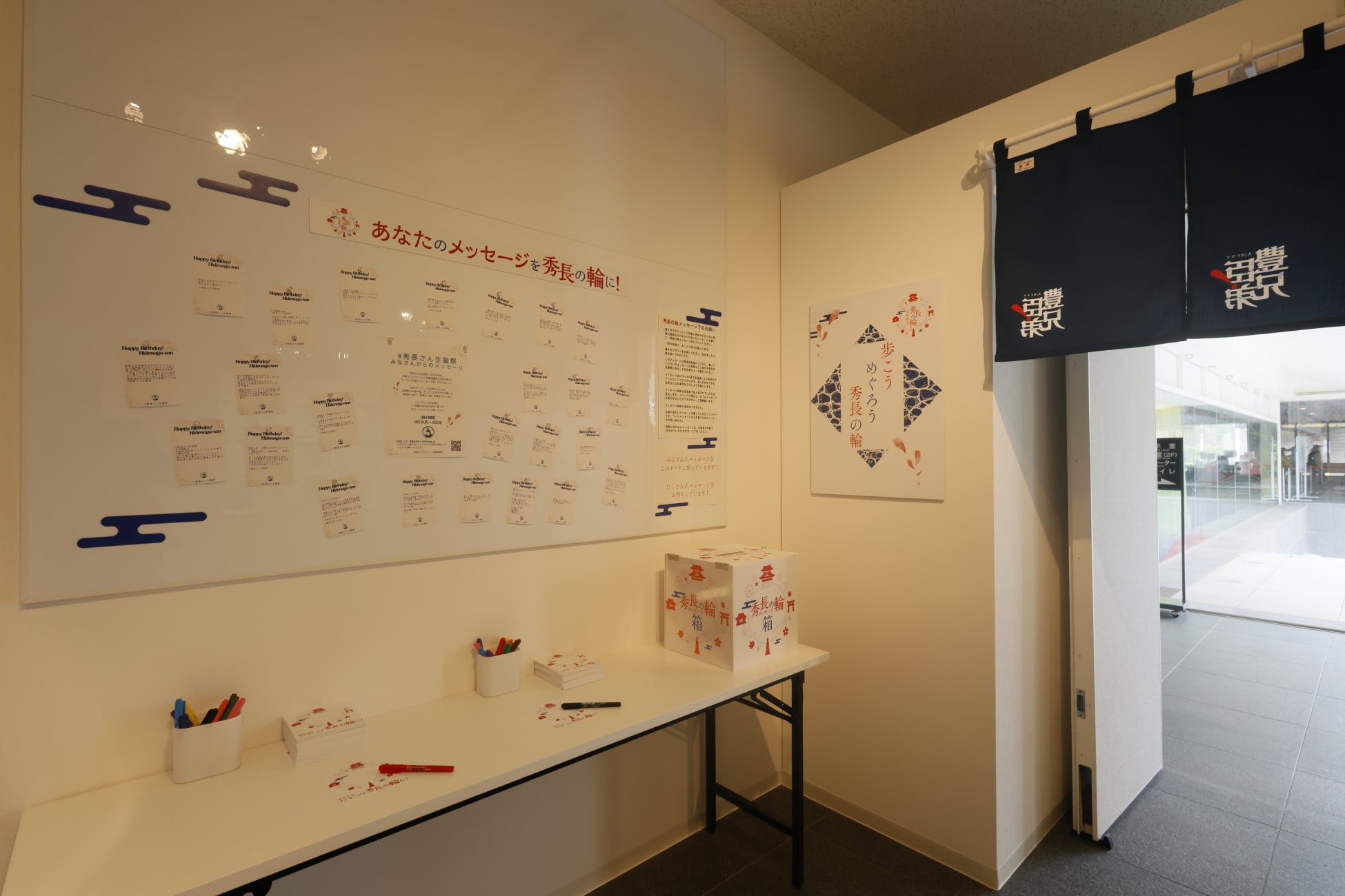 エピローグゾーンのメッセージコーナーでは、来館者がメッセージを書けるコーナーをご用意。あわせて3月8日(日)まで、秀長さんプロジェクト推進協議会公式Xにて募集した「#秀長さん生誕祭」のメッセージを展示します。