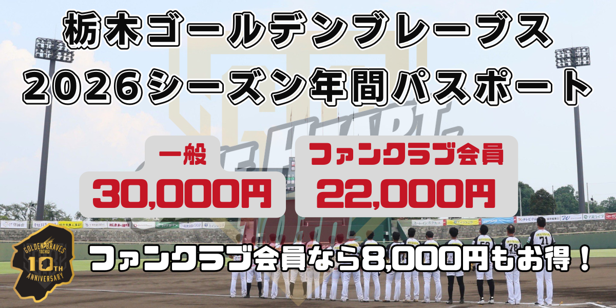 栃木ゴールデンブレーブスでは、2026シーズンの年間パスポートの販売概要が決定いたしましたので、お知らせいたします。年間パスポートをご購入いただくと、チケットの都度購入が不要となり、栃木ゴールデンブレーブス主催ホームゲームをお得にご観戦いただけます。ぜひこの機会にお買い求めください。10周年という節目のシーズンを、ぜひ球場で共に戦いましょう!
