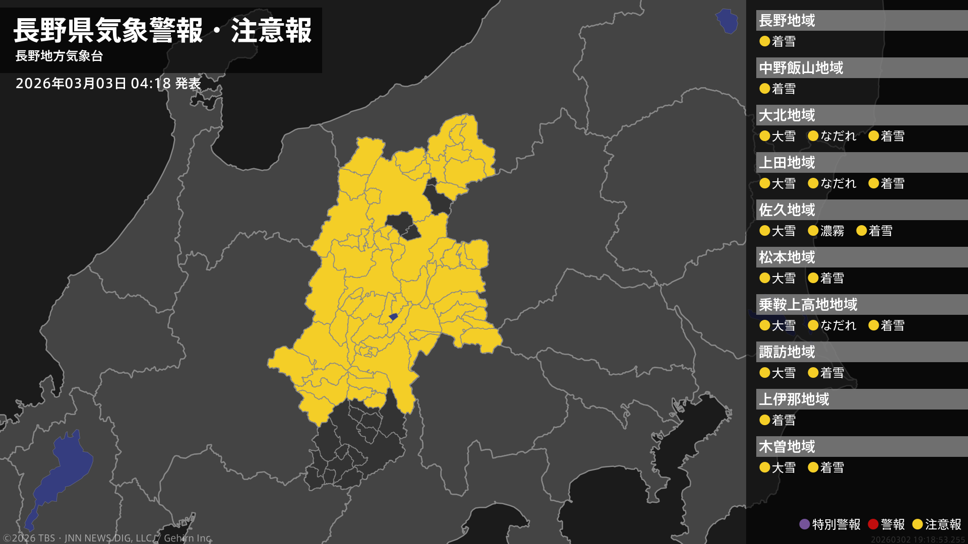 【なだれ注意報】長野県・乗鞍上高地、上田市、大町市、白馬村、小谷村に発表(雪崩注意報) 3日04:18時点