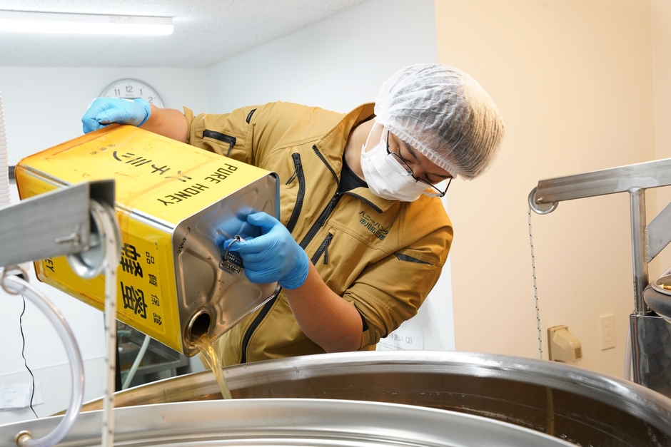 その取り組みをさらに深化させたのが、三代目社長であり“ハニーハンター”として世界を巡る市川拓三郎です。年間300種類以上の蜂蜜を味わい、花や産地ごとの特性を見極める中で、「蜂蜜の個性をミードとして表現できないか」と模索。2017年より委託醸造による国産ミード造りを本格化させました。