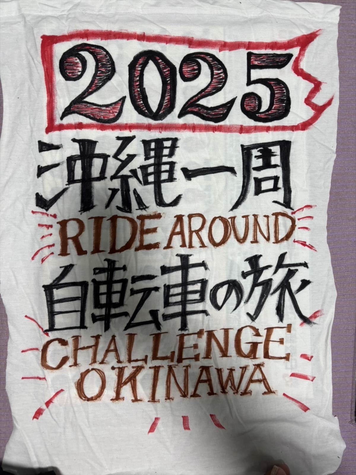 2025沖縄一周と書かれた黄色のビブス。これも旅のファンから送っていただいたもので送ってくれた理由が。