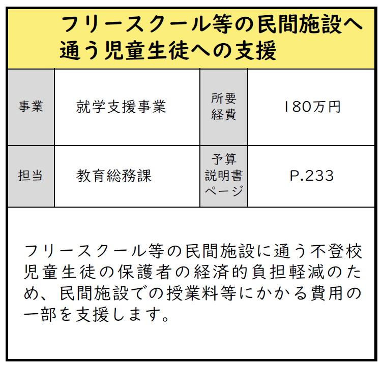 今年度の予算に、「フリースクール等の民間施設へ通う児童生徒への支援」というものがあります。