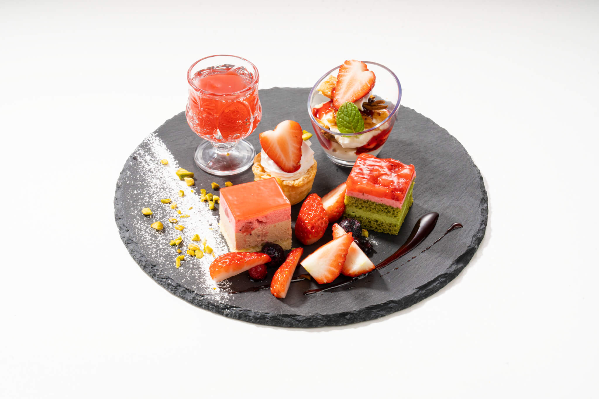 フレッシュなタルトや濃厚なケーキ、爽やかなジュレなど、一皿で「甘酸っぱい」「クリーミー」「みずみずしい」といった、いちごの持つ多彩な表情を一度に楽しめる欲張りなプレートです 。ティータイムの優雅なひとときにどうぞ 。