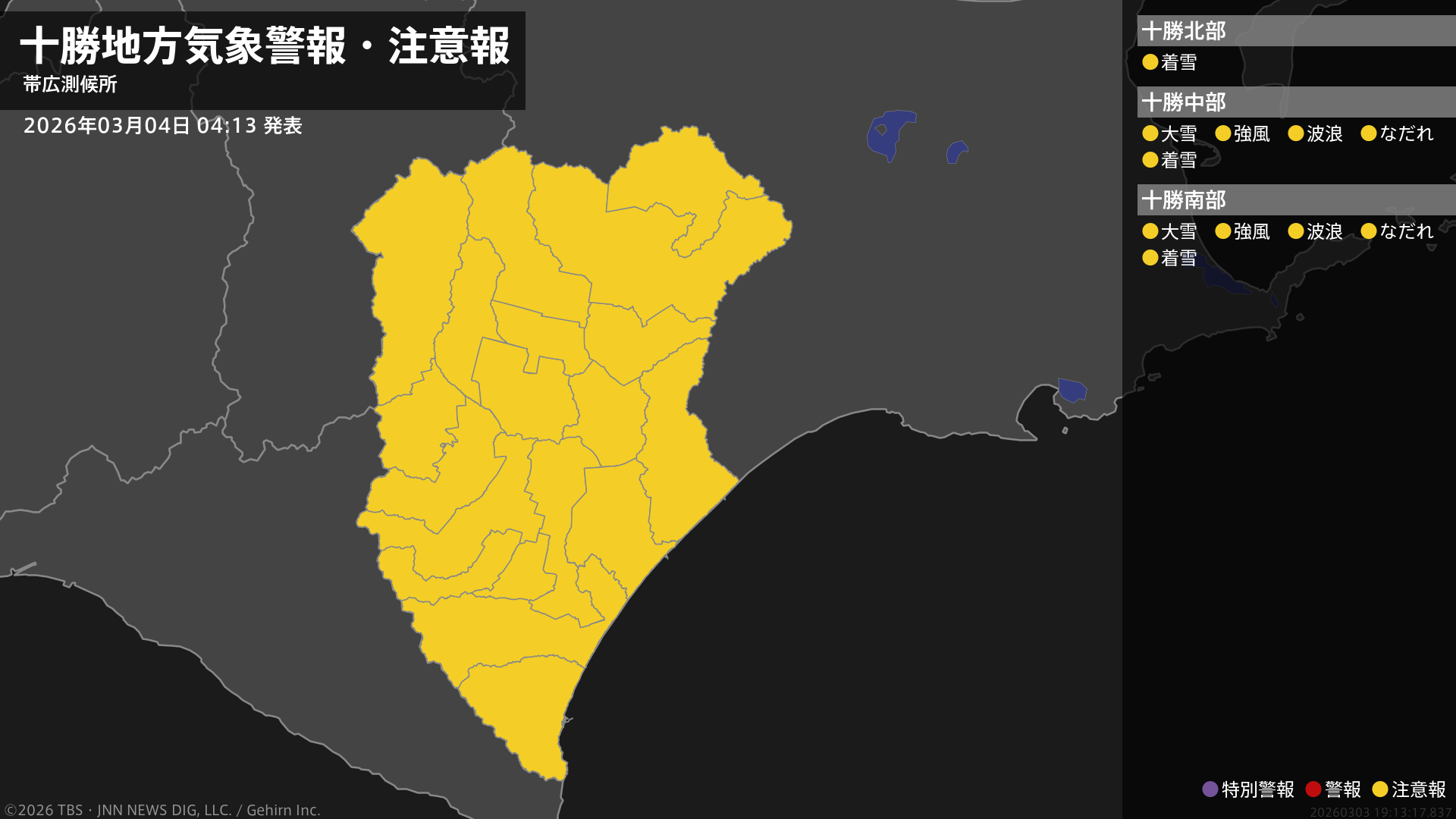 【なだれ注意報】北海道・帯広市、音更町、清水町、芽室町、中札内村、更別村などに発表(雪崩注意報)  4日04:13時点
