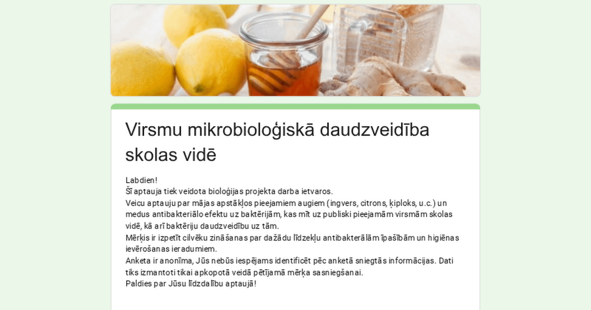 こんにちは皆さん。 アンケートにはさらに多くの回答者が必要です。所要時間は 3 分以内です。 この調査は、お茶、生姜、蜂蜜など、家庭環境でよく使用される治療法に関するものです。私自身、結果に非常に興味があるので、単なる統計のために結果を記入したくありません。 よろしくお願いします!! Latvia