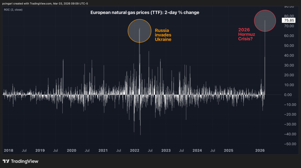 欧州の天然ガス価格は月曜日に40%、火曜日に30%上昇し、48時間で基準価格は2倍近くになった。これはウクライナ戦争の初期以来見られなかった動きである。