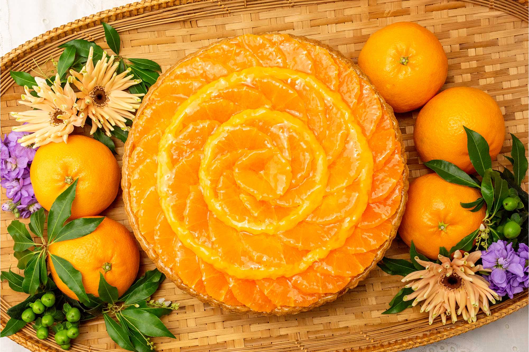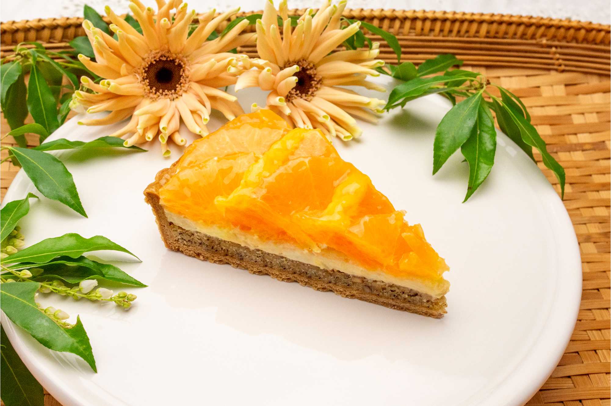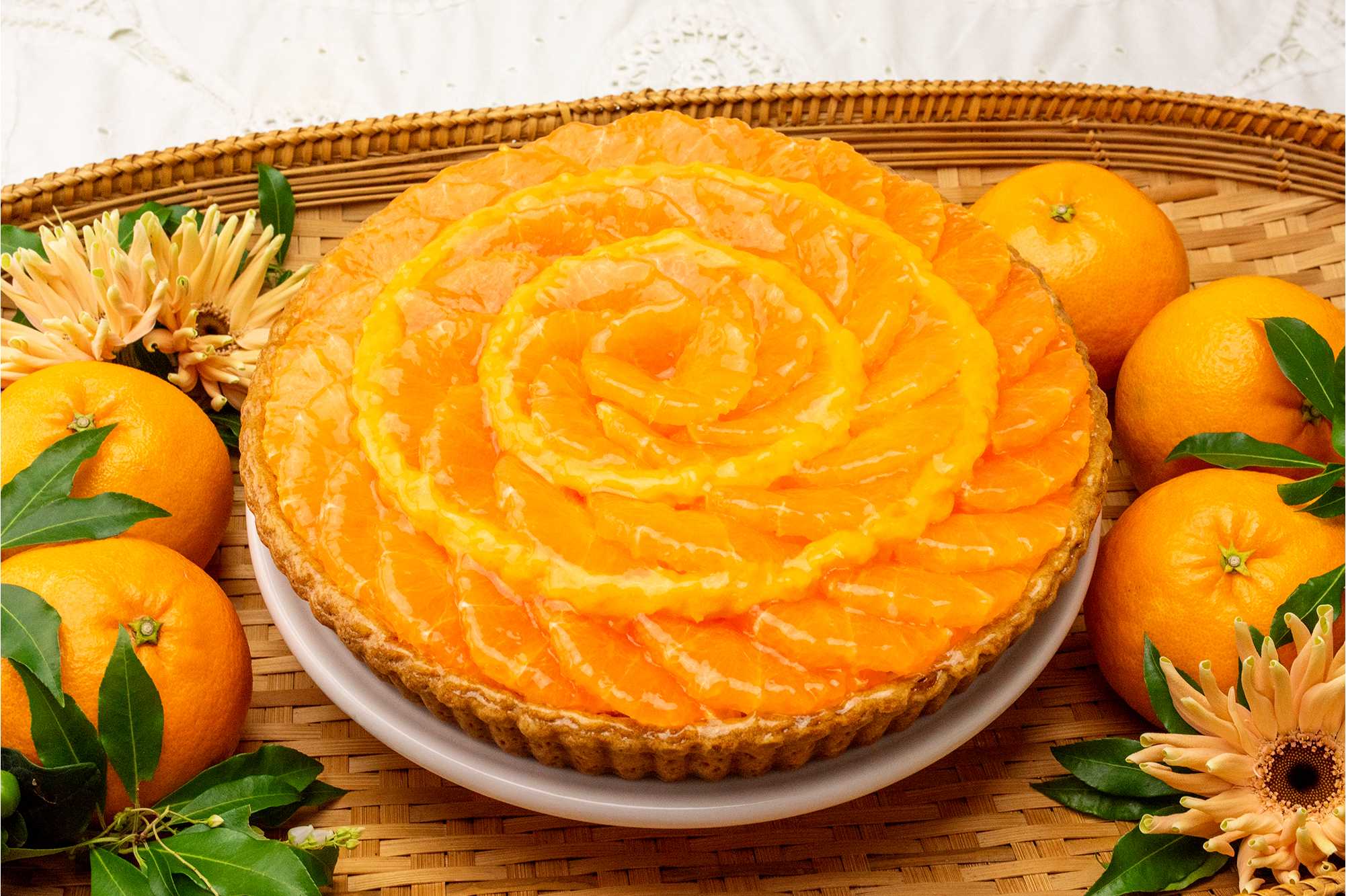 サクサクのタルト生地に、香ばしいヘーゼルナッツ入りのアーモンドクリームと、爽やかなオレンジムースを重ね、みずみずしい“にじゅうまる”の果実をタルト一面に美しく並べました。“にじゅうまる”を皮ごと使用した自家製ジャムで「二重丸」を描いた、味も見た目もまさに“にじゅうまる”のタルトです。オレンジ色の美しい見た目と柑橘の爽やかな香りとともにお楽しみください。