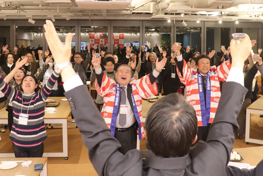 3連休初日の2月21日夜。静かな東京・大手町のオフィス街の一角で、赤い法被姿の鈴木浩幸町長と元副町長の川口幸男さんが来場者を出迎えた。