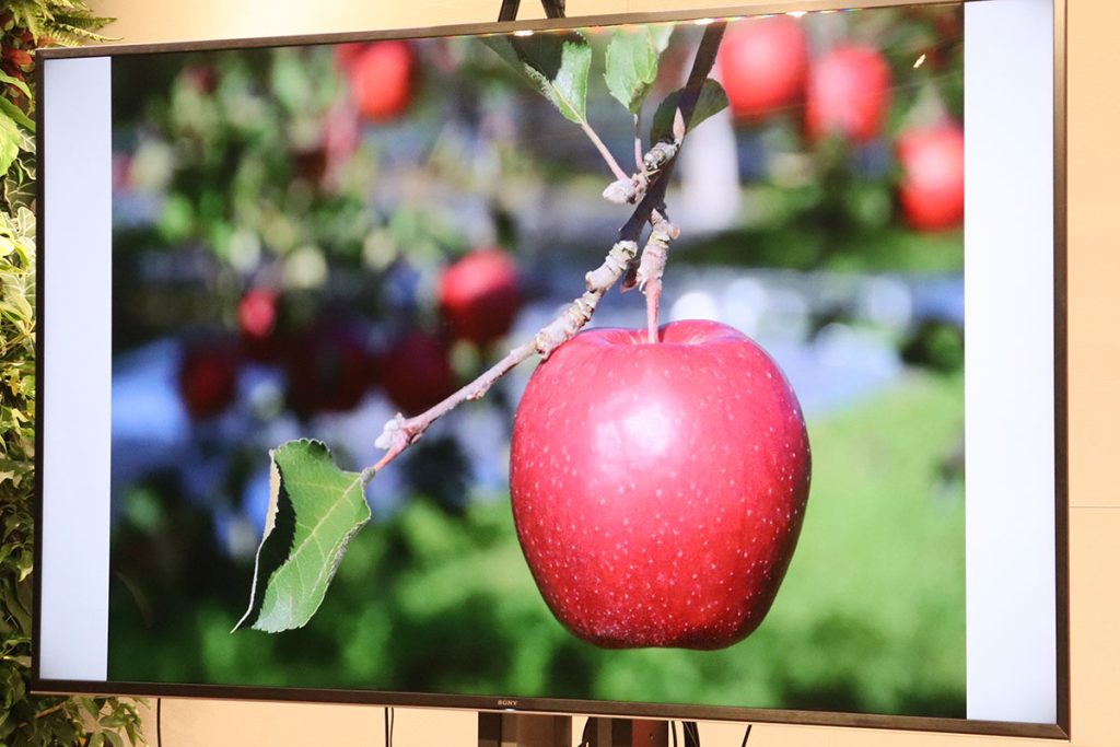 会場で、基幹産業のリンゴの写真も披露された(杉浦美香撮影)