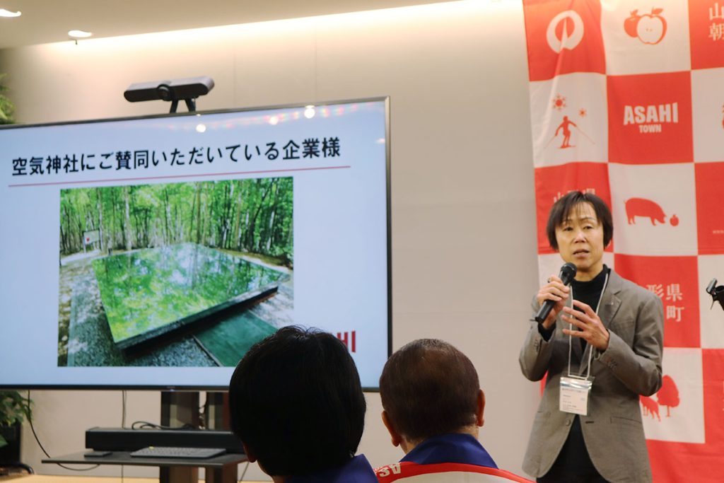 会の冒頭、鈴木町長は町が誇る、空気神社に言及した。「地球温暖化の影響で大雨や洪水、津波といった災害が世界で起きている。朝日町には市民の発案で、環境を大切にしたいという思いでできた空気神社がある」と町長。