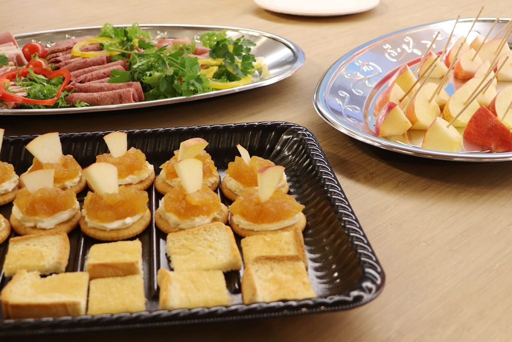 会場では朝日町の特産物を使った料理が並べられた(杉浦美香撮影)
