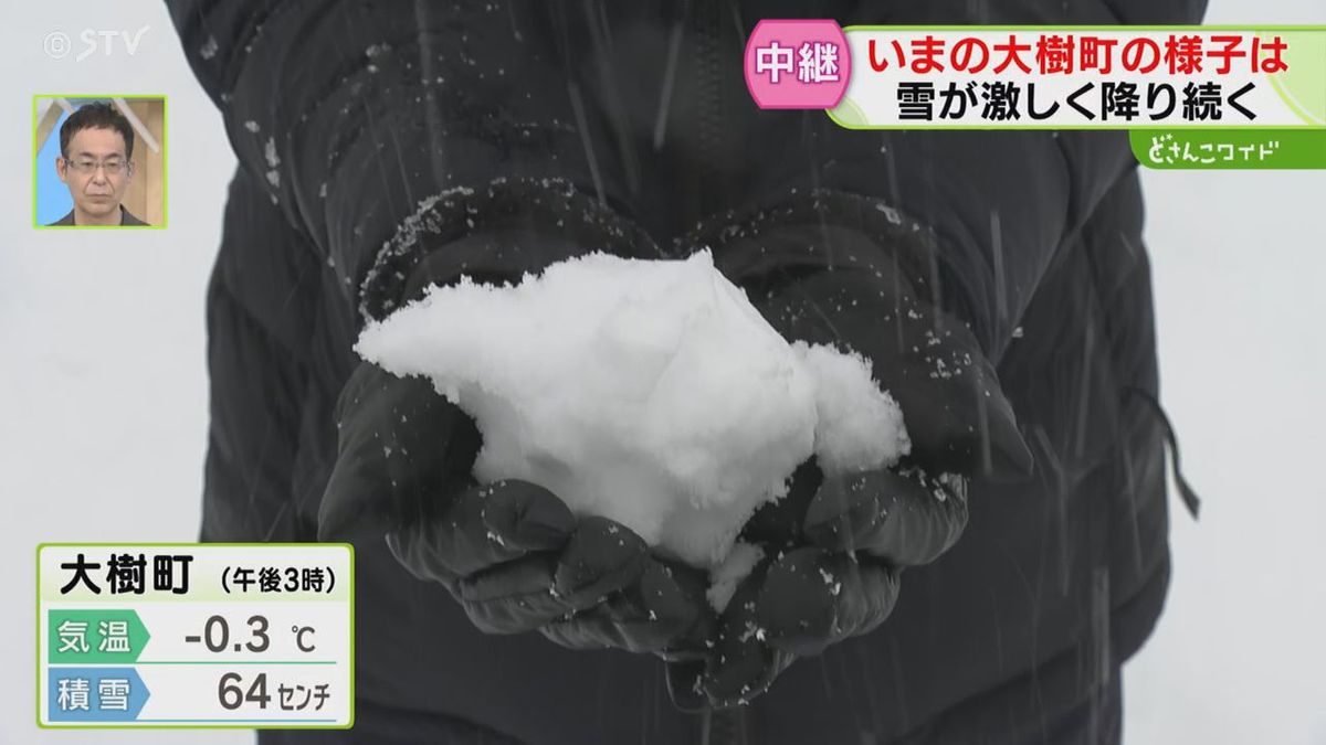 触ってみますと、少し軽く握っただけでこのように固まるような、水分の含んだ雪が降っています。