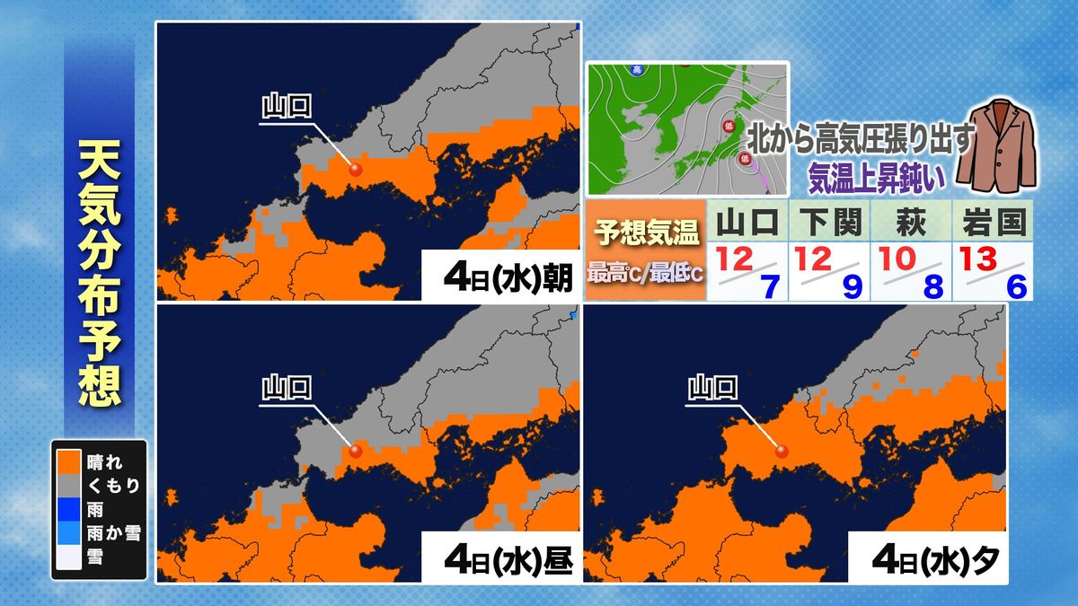 日本海側では、今夜もまだ細かい雨が降る所があるでしょう。あす4日(水)は日中は日本海側を中心に曇りがちですが、夕方頃から徐々に県内広範囲で晴れ間が出てくる見込みです。冷たい北風の流れ込みが続くことで、最高気温で10度ちょっとか、山間部は1桁にとどまる所もあるなど、空気の冷たさが体に堪える一日となります。さらに夜にかけて、グッと冷え込みが増してきそうです。しっかり厚着など心掛けましょう。