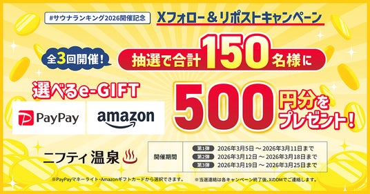 ニフティ温泉サウナランキング2026の公開を記念して、Xにてフォロー&リポストキャンペーンを開催予定です。