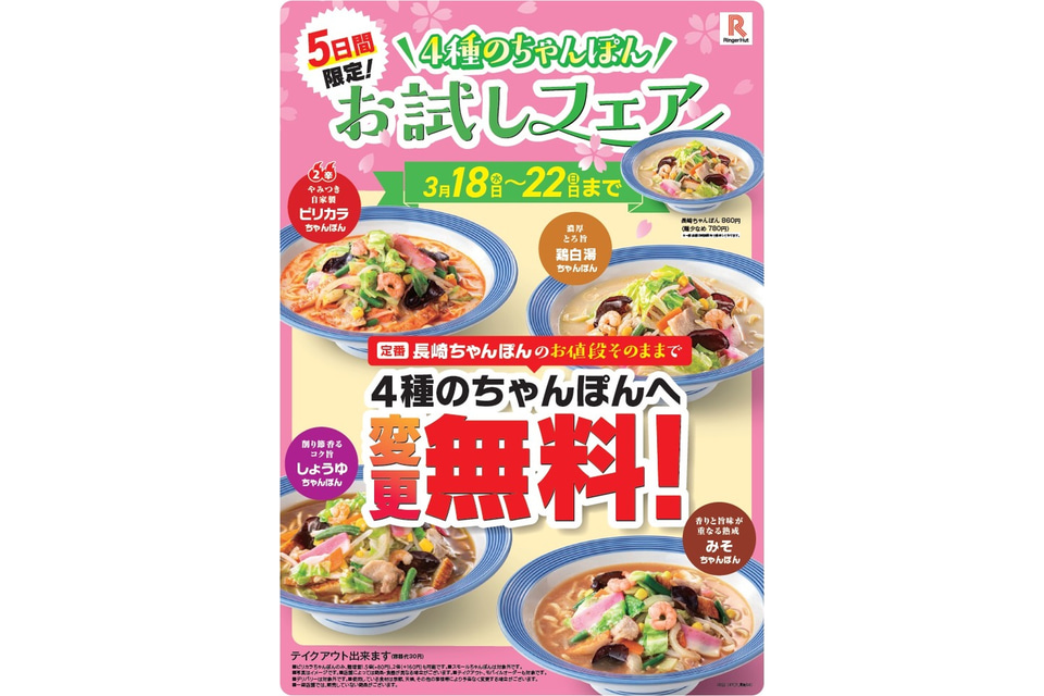 長崎ちゃんぽん専門店「リンガーハット」は、「ピリカラちゃんぽん」「しょうゆちゃんぽん」「鶏白湯ちゃんぽん」「みそちゃんぽん」を「長崎ちゃんぽん」の価格860円(特別価格880円)で提供する「4種のちゃんぽんお試しフェア」を3月18日~22日に実施する。