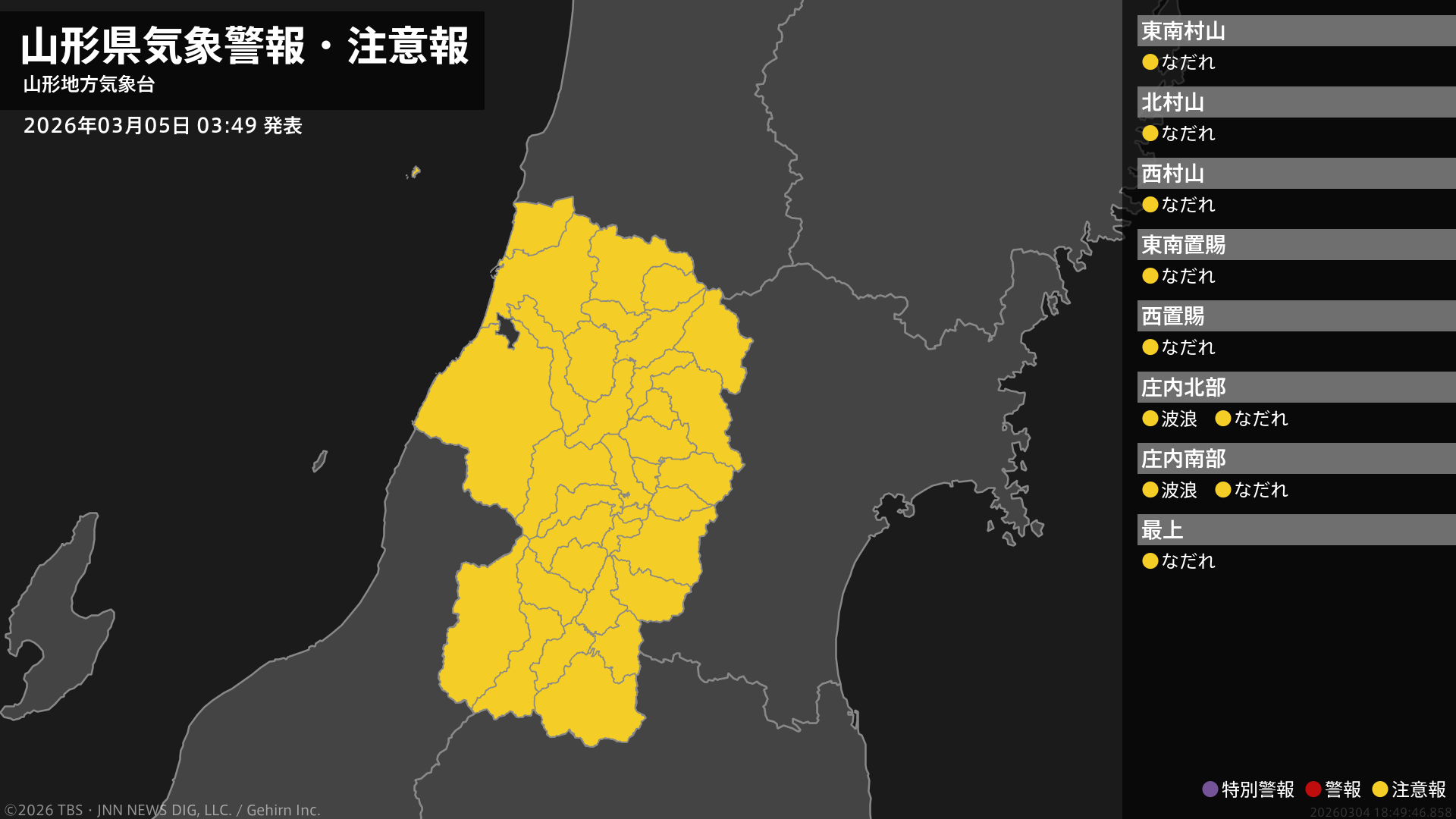 気象台は、午前3時49分に、なだれ注意報を山形市、米沢市、鶴岡市、酒田市、新庄市、寒河江市、上山市、村山市、長井市、天童市、東根市、尾花沢市、南陽市、山辺町、中山町、河北町、西川町、朝日町、大江町、大石田町、金山町、最上町、舟形町、真室川町、大蔵村、鮭川村、戸沢村、高畠町、川西町、小国町、白鷹町、飯豊町、庄内町、遊佐町に発表しました。