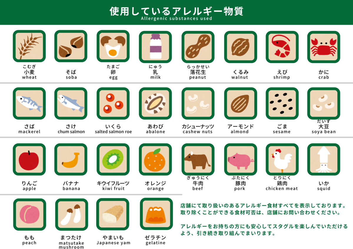 フードヴィレッジ、ファミリアランド、SWEETS ROADに出店する店舗を対象に、下記のアレルギー表示を統一して掲示しています。