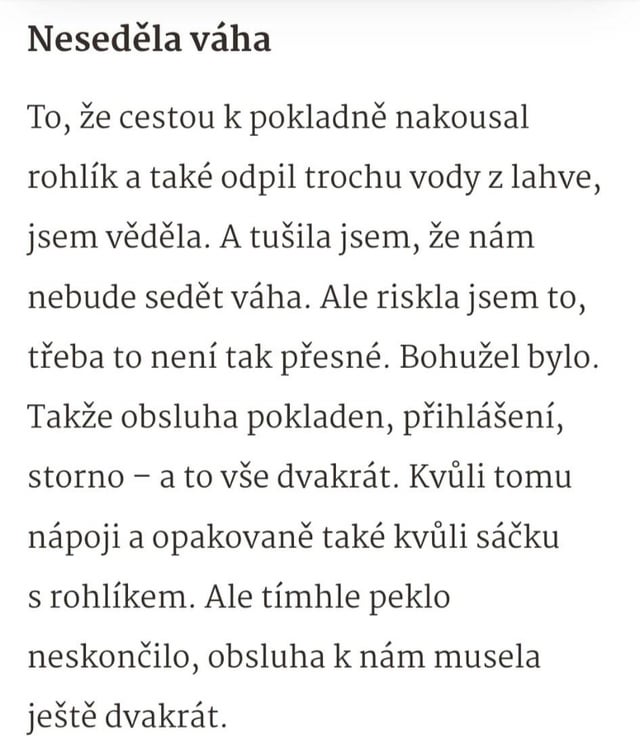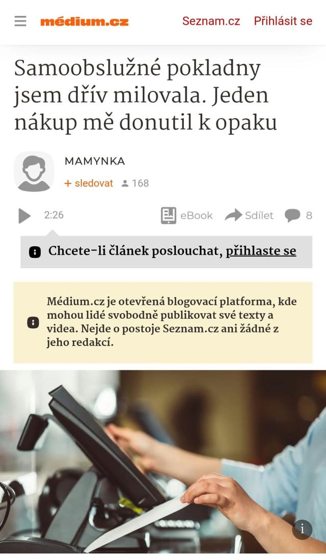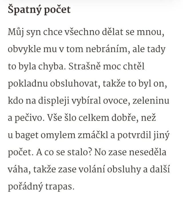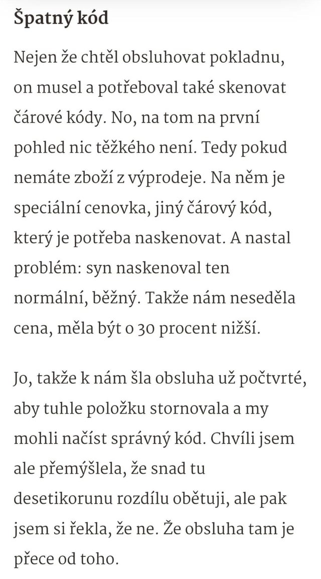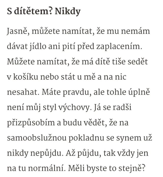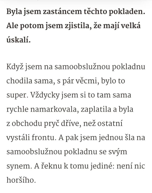 最後の部分は作者を少し救ってくれるかもしれないが、それでも。 断っておきたいのですが、私は親ではないので、子育てがどのようなものかわかりませんが、私から見ると、これは親が子供の面倒を見る能力がないのにセルフレジのせいにしているように思えます。あなたの意見は何ですか? 記事へのリンク: https://medium.seznam.cz/clanek/mamynka-samoobsluzne-pokladny-jsem-driv-milovala-jeden-nakup-me-donutil-k-opaku-248144 Czech Republic