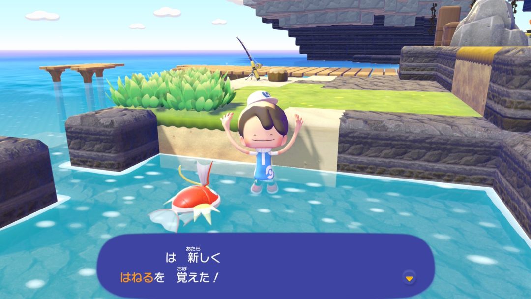 ところが『ぽこ あ ポケモン』では、コイキングになかなか重要な役が与えられている。本作にてコイキングは、最初の街「パサパサこうやの街」の浜辺で遭遇することができる。気づいたら浜でハネていたというコイキングは、通りかかったメタモンに、昔の居場所を彷彿とさせるすみかを作ってほしいと依頼。すみか「海釣り」を作り上げると、コイキングはお礼としてメタモンに技「はねる」を教えてくれる。この「はねる」の本作での扱いが、SNS上でにわかに脚光を浴びているかたちだ。