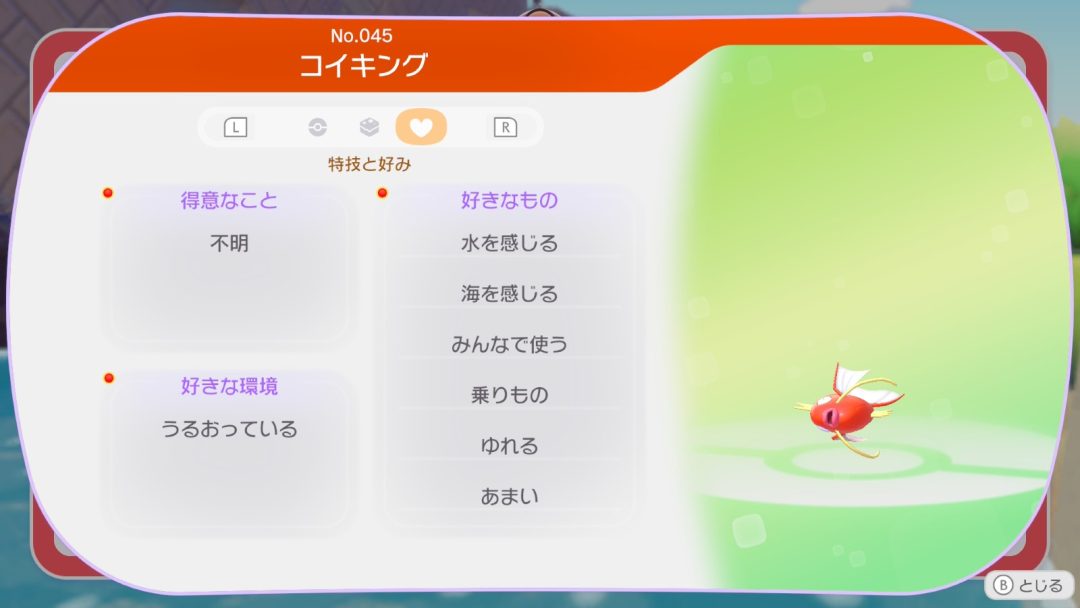 ただし、肝心のコイキングについては得意なことは「不明」とされている。連れ歩いたりしても、特に自発的に何かを手伝ってくれることはない様子。メタモンが「はねる」を覚えた後はやはり頼りないポケモンであり、イメージどおりのキャラクター性を守り抜いている。よく考えるとコイキングや「はねる」ではなく、メタモンの応用力が光る演出なのかもしれない。
