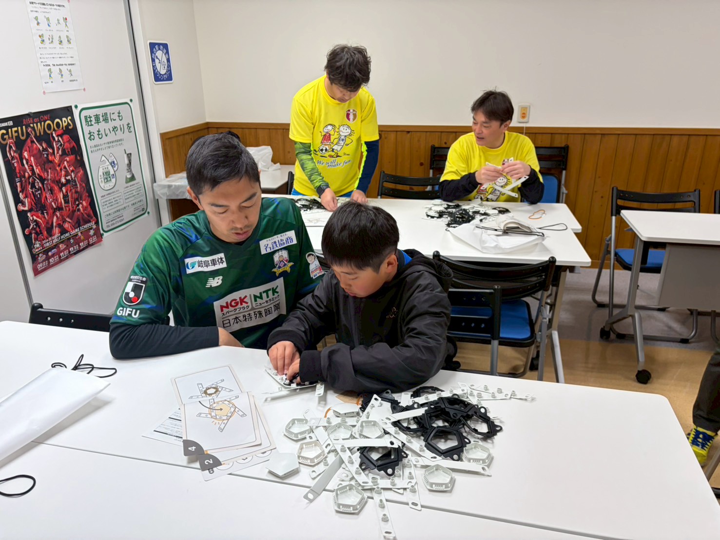 サッカーボール組み立ては、バラバラな部品から説明書を見ながら組み上げるという難易度が高めではありましたが、保護者やサポートの方と一緒に作り上げていました。作り上げた時の「やったー」という声が上がっていました。実際にそのボールは蹴ることも可能で、子どもたちは、リフティングや蹴ったりして楽しんで、作ったボールは子どもたちにプレゼントされました。