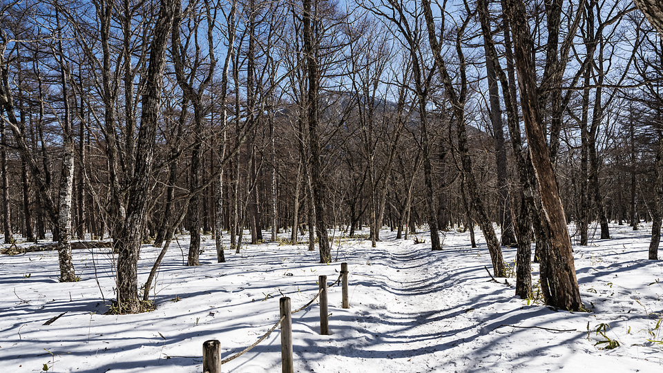 標高は1400mあるため、春は遅くまだ雪が残っている。整備されている道や木道にも雪や凍った場所もあり、スノートレーニングシューズや簡易アイゼンなどの滑り止めが必要だ。アップダウンも緩やかなのでのんびり歩いて行ける。