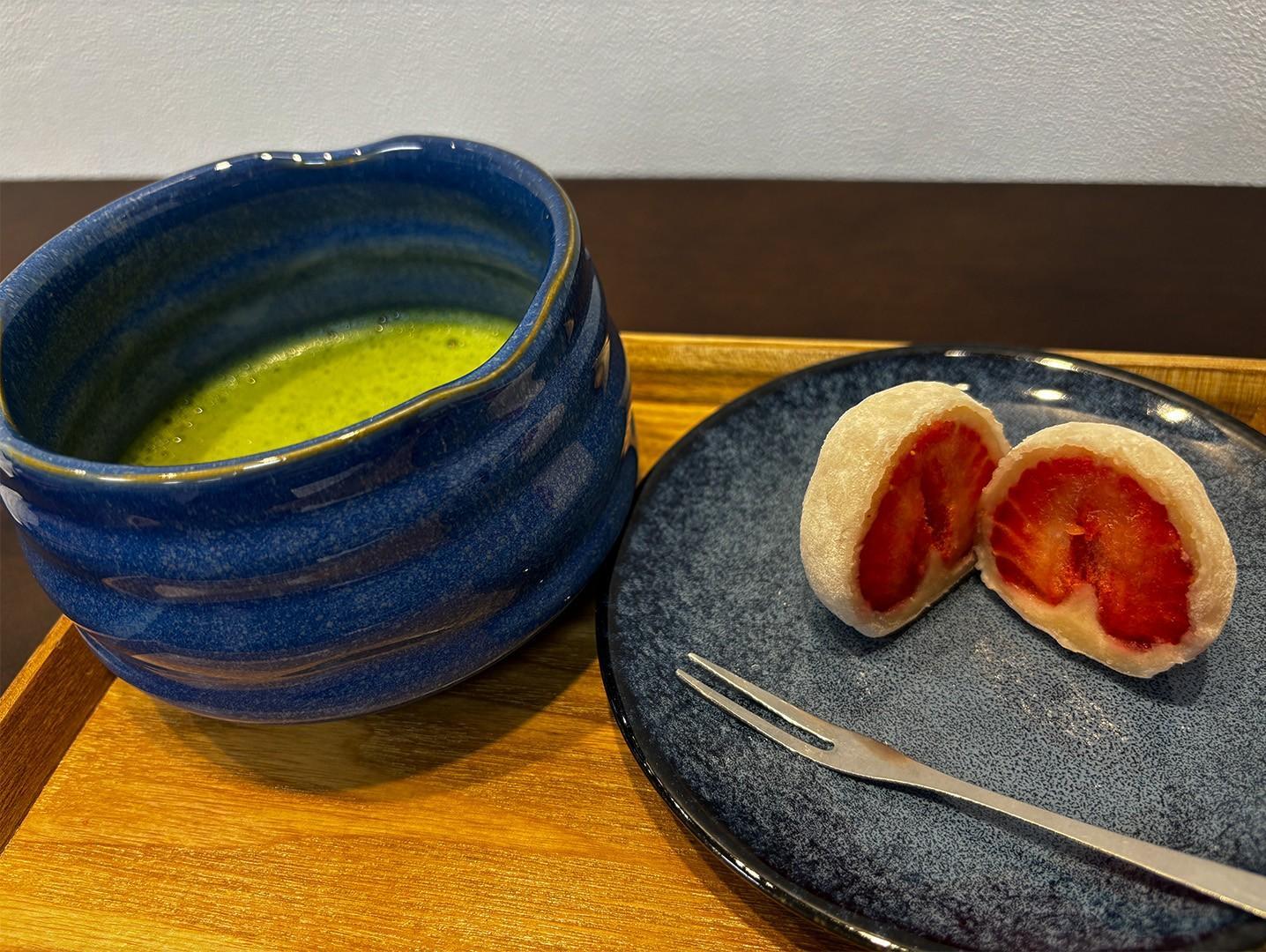 青と黒の陶器で統一され、大福と抹茶が提供されました。