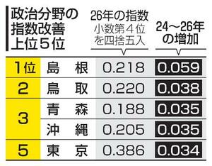 指数は「1」に近いほど平等を示す。各分野の1位は、政治が都や区議会の女性比率が高い東京(0・386)、行政は女性登用を進めてきた鳥取(0・514)で、いずれも5年連続。教育の徳島(0・730)、経済の高知(0・455)も2年連続で4分野の上位は変動が少なかった。