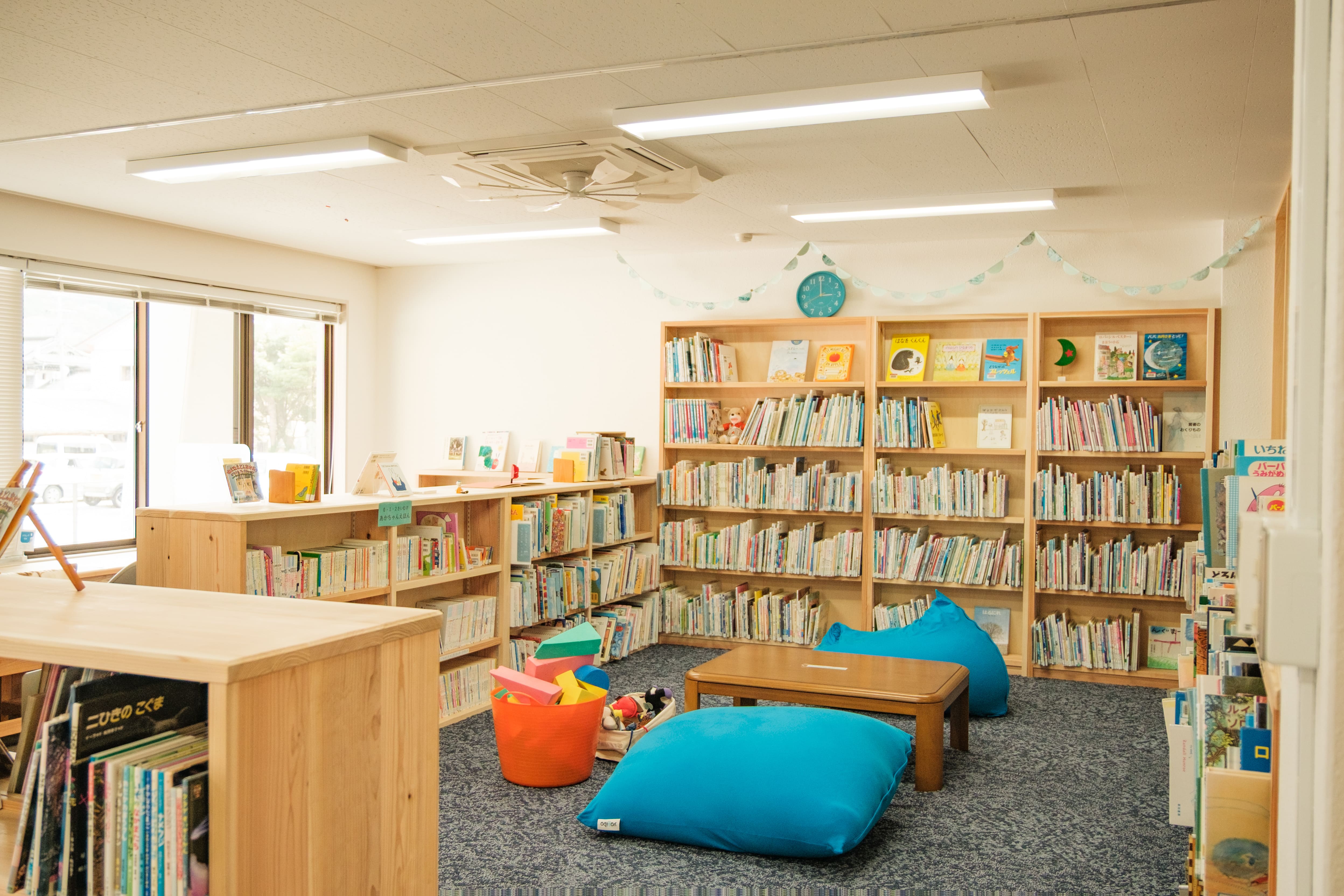 開発センター入って左手側に、絵本・児童書が並ぶえほんのへやがあります。ゆっくりくつろぎながら本を楽しめます。