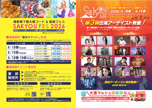 ![[プレゼント]抽選で40名様に鳥取県下最大級野外フェス「SAKYOU FES.2026」Aエリアチケットプレゼント! | 鳥取マガジン [プレゼント]抽選で40名様に鳥取県下最大級野外フェス「SAKYOU FES.2026」Aエリアチケットプレゼント! | 鳥取マガジン](https://www.walknews.com/wp-content/uploads/2026/03/11de569df318f4e002ae10ad2d983a82-1536x864.png)