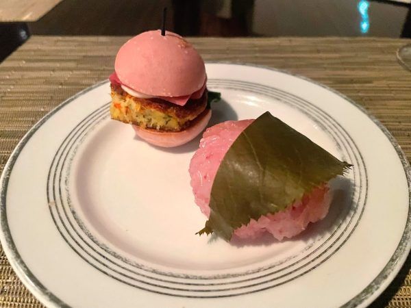 見た目もかわいい桜色の小さなバーガーの中には、旨味がギュッと閉じ込められたクラブケーキが。 ふわっとした食感で、そこに赤かぶのマリネも加わり、見事な味わいに! 春の香りがただよう手毬寿司は、もちもちの食感と生ハムの塩気がアクセントとなり、和と洋の世界観を楽しみながらいただきました。