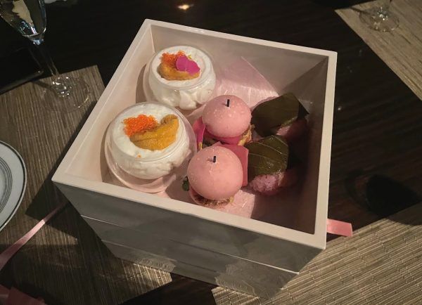 ここからは三段に詰め込まれた料理を一品ずつ先にご紹介していきますね。 まずは1段目、写真左から ・ウニと新たまねぎのムース コンソメジュレ ・クラブケーキと赤かぶのマリネ 桜色バーガー ・桜とローゼル 生ハムの手毬寿司