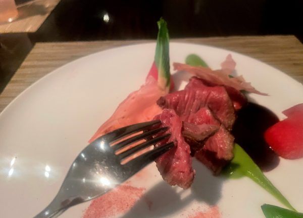 ・宮城県栗原市産黒毛和牛のローストビーフ 桜のクリームチーズソースと赤ワインのリダクション
