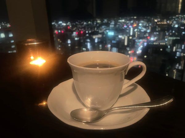デザートと一緒にいただいたコーヒーは、コクのあるやわらかい味でとても飲みやすく、喉越しなめらか。 窓の向こうに広がる夜景を見ながら、特別な一杯をいただきました。