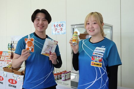 3月7日(土)・8日(日)の2日間、会場内の「全農ブース」では来場者の皆さんにも「もぐもぐブース」で選手に提供している全農グループ取扱い商品をお渡ししました。商品は青森県産飲料やエ―コープのもちもちミルクパンなど全8種で、提供日時によってラインナップを変更しました。来場者は選手と同様の「ニッポンの食」を手に栄養補給を行いながら観戦を楽しんでいました。