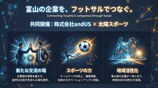 株式会社andUS(本社:富山県富山市、代表取締役社長:廣岡伸那、以下「アンダス」)は、株式会社太陽スポーツと2026年5月16日(土)に 「第1回 andUS × 太陽スポーツ CUP 企業交流フットサル大会」 をアイザックスポーツドーム(富山県富山市八木山84)にて開催いたします。
