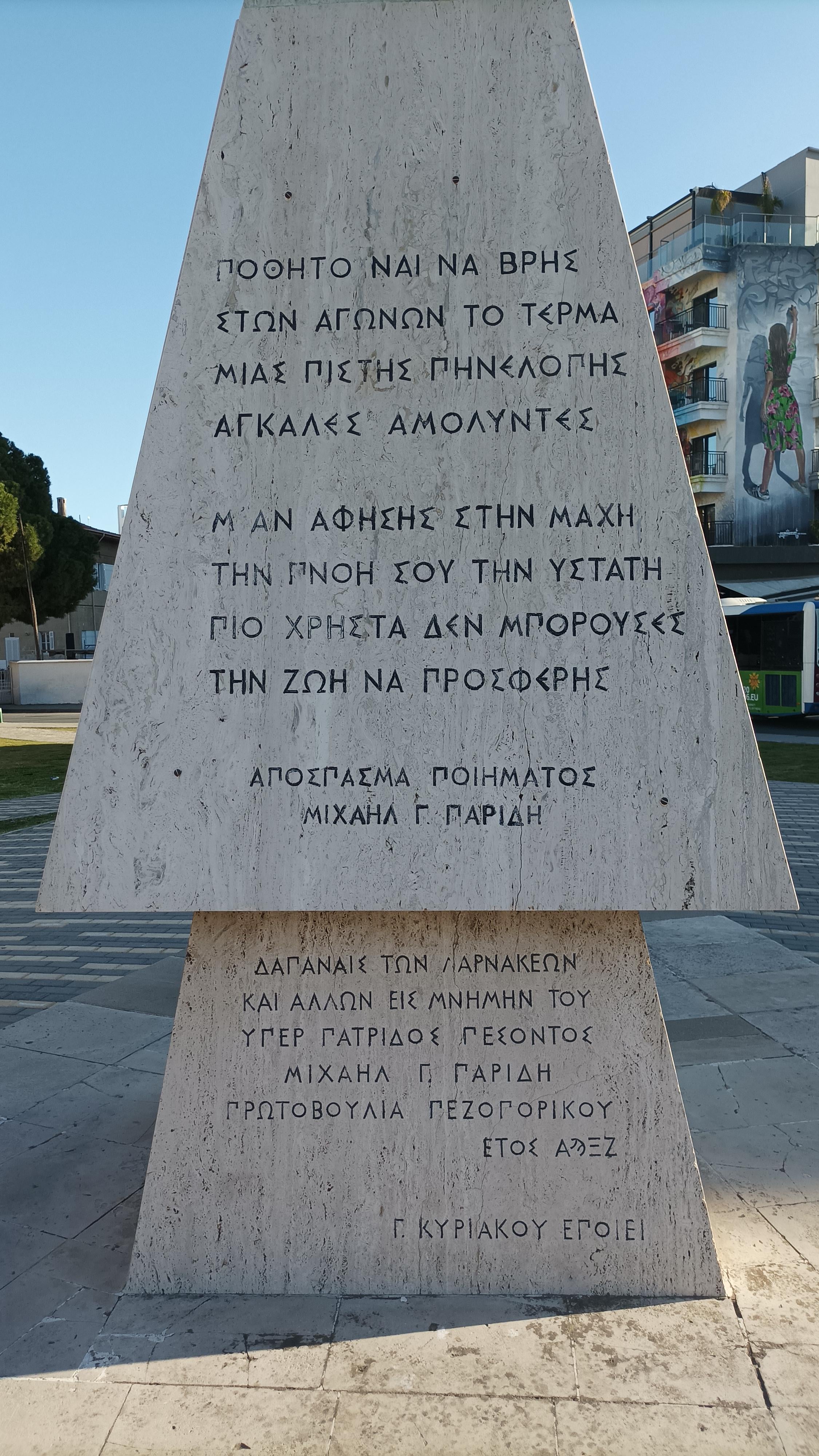 こんにちは。ラルナカで銅像を見つけたので碑文の写真を撮りましたが、Google 翻訳を使用すると翻訳が少しおかしくなります。誰かこの碑文の意味を説明してもらえませんか?