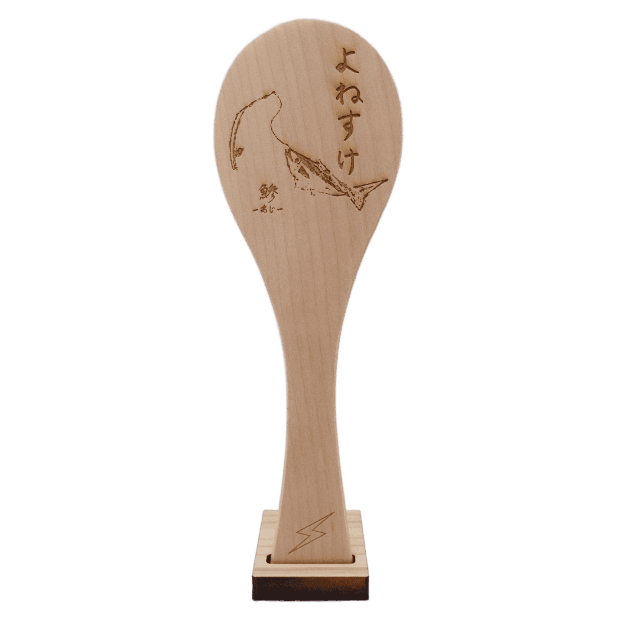 本当に使うことができるようにデザイン部分はレーザーで加工した実用的なしゃもじです。名前の他に本人が好きな釣りのイラストが入っています。また、台座もセットで入っており飾ることも可能です。※お手入れ方法として食器洗浄乾燥機のご使用は推奨しません。