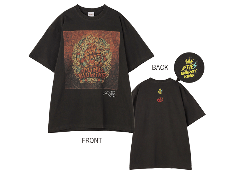 テリー選手のファンキーなキャラクターをデザインに落とし込みました。「MiND BLOWiNG」のフレーズは、テリー選手がダンクを決めた後に行うお馴染みのポーズを表しており、たくさんのバッテリー(電池)はテリー選手の常にエナジー全開なプレースタイルを表現しています。また日頃から自作の楽曲を作成していることにちなみ、音符のマークも散りばめられています。枠外にはサインのプリントもあり、シャツの背面にはキャッチコピーである「ENERGY KING」のロゴもワンポイントで入っています。