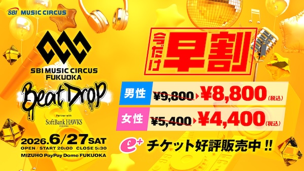 2018年より福岡で開催し、若年層を中心に高い支持を集めてきたオールナイト音楽フェス「MUSIC CIRCUS FUKUOKA」が今回から新シリーズを始動。SBI MUSIC CIRCUSと福岡ソフトバンクホークスが共催で、6月27日(土)にみずほPayPayドーム福岡で「SBI MUSIC CIRCUS FUKUOKA -Beat Drop- partner with SoftBank HAWKS」を開催する。HIPHOPを軸に圧倒的なライブパフォーマンスと演出を追求した、音楽を深く体感できるオールナイト・フェスとなる。