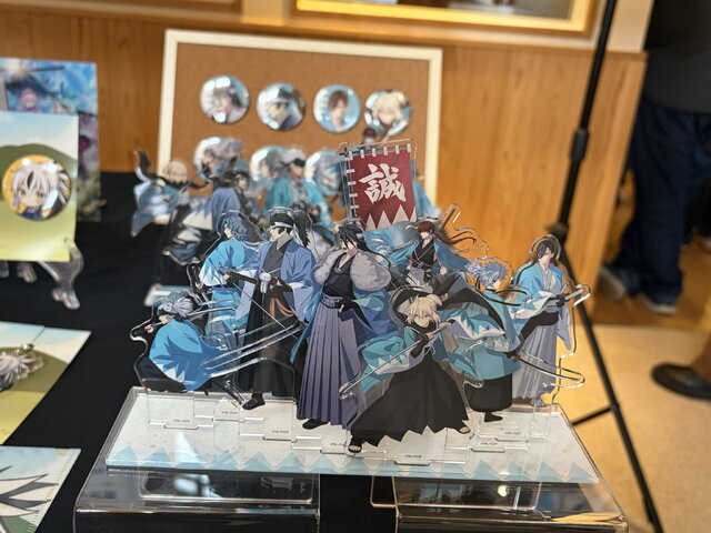 会場入口から入った交流ラウンジでは物販と展示が行われています。物販ではイベントに合わせた限定商品などもサンプル公開されていて、エリちゃんのTシャツやロウヒを意識したブランケット、新撰組のアクリルスタンドなどが注目を集めていました。